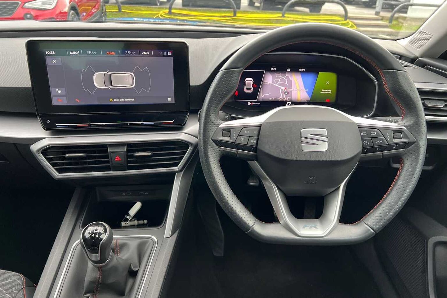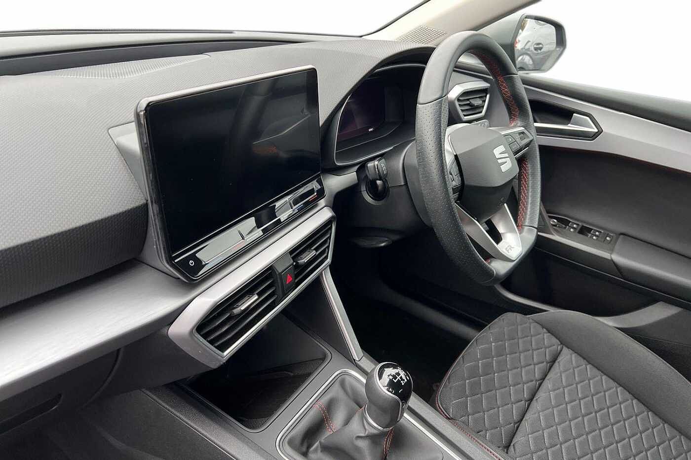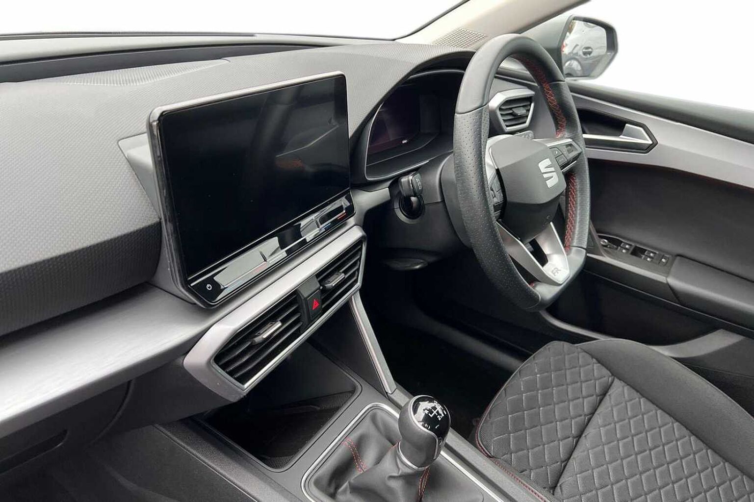 • Flat bottomed perforated leather steering wheel with red stitching and FR logo and leather gear stick