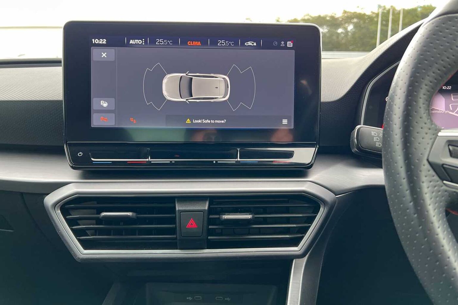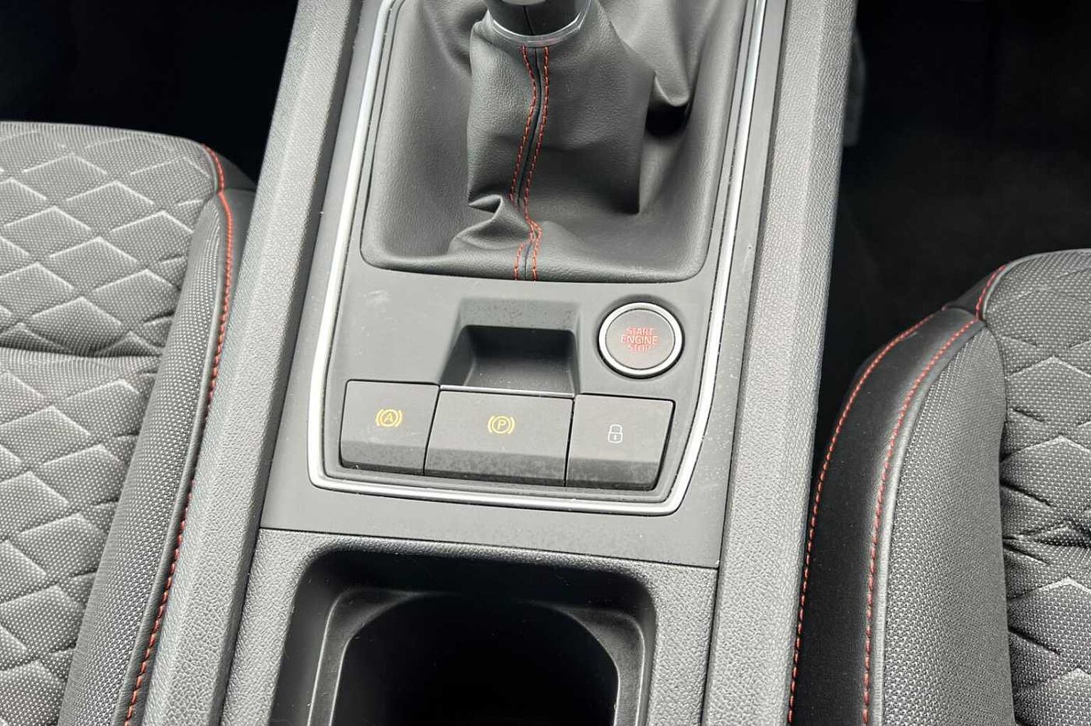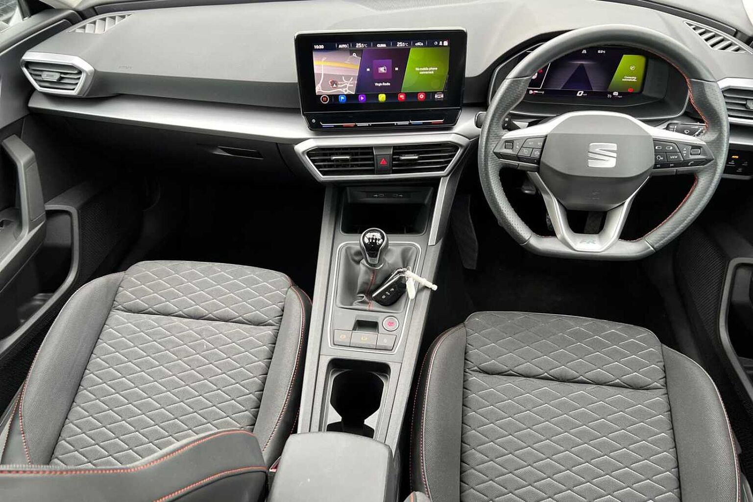 • Flat bottomed perforated leather steering wheel with red stitching and FR logo and leather gear stick